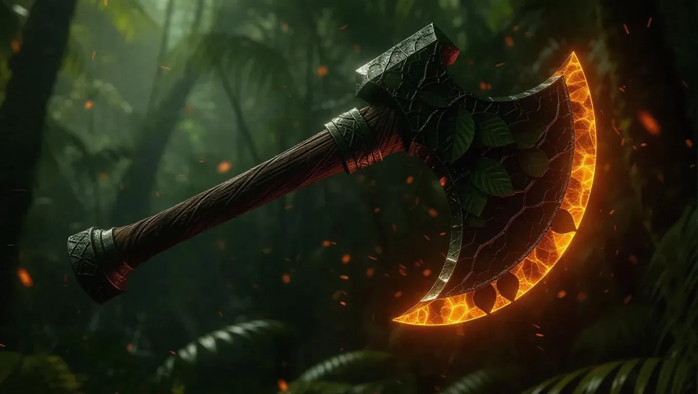 A battle axe forged from layered leaves, featuring a fiery orange core that crackles with energy, boasting a bold and powerful design, set against a dense jungle backdrop that emphasizes its formidable strength.
