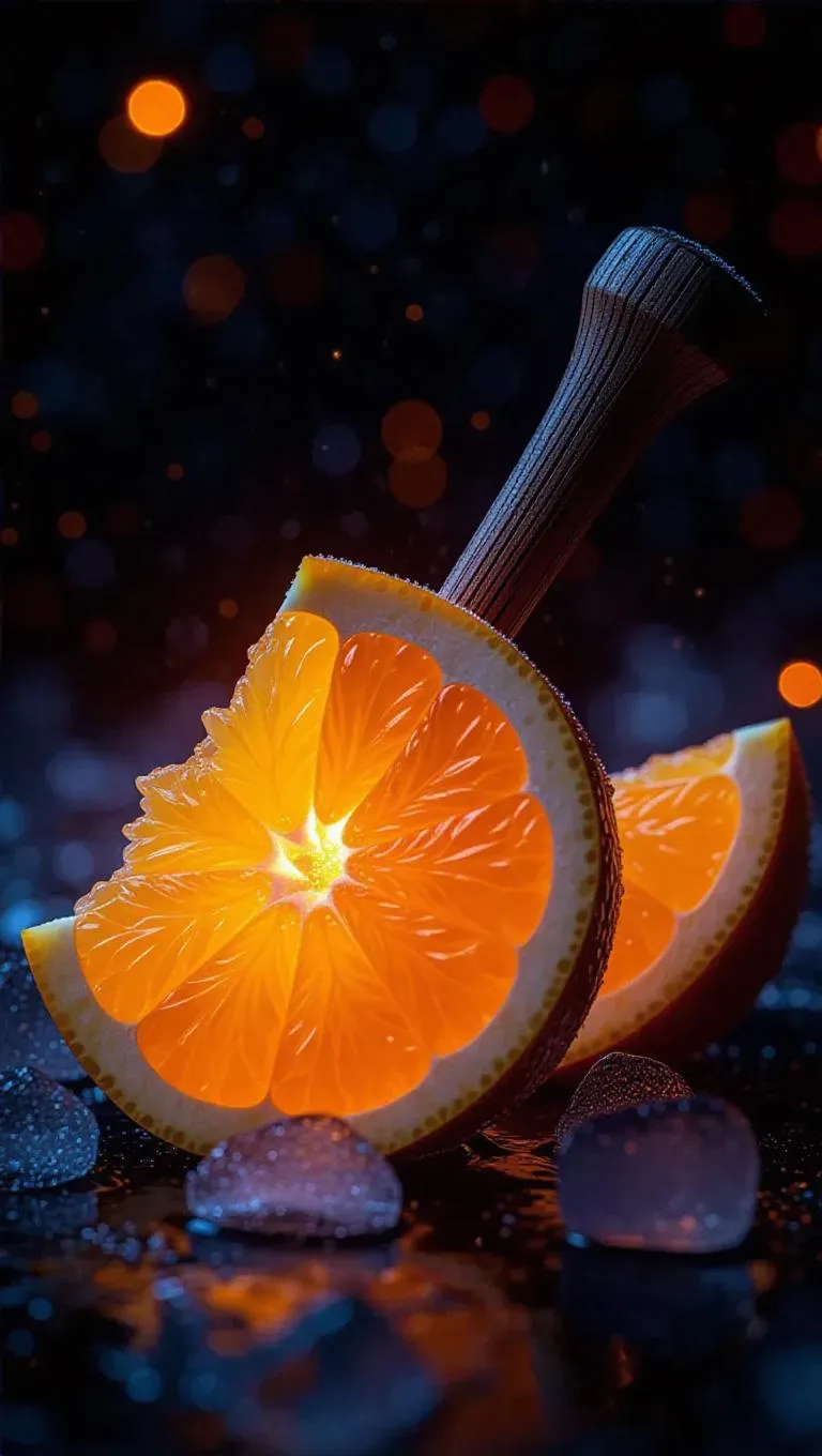 Axe crafted from vibrant orange slices, shimmering with icy frost particles, glowing with a cold, ethereal light, set against a dark, mystical background, capturing the essence of frosty magic.