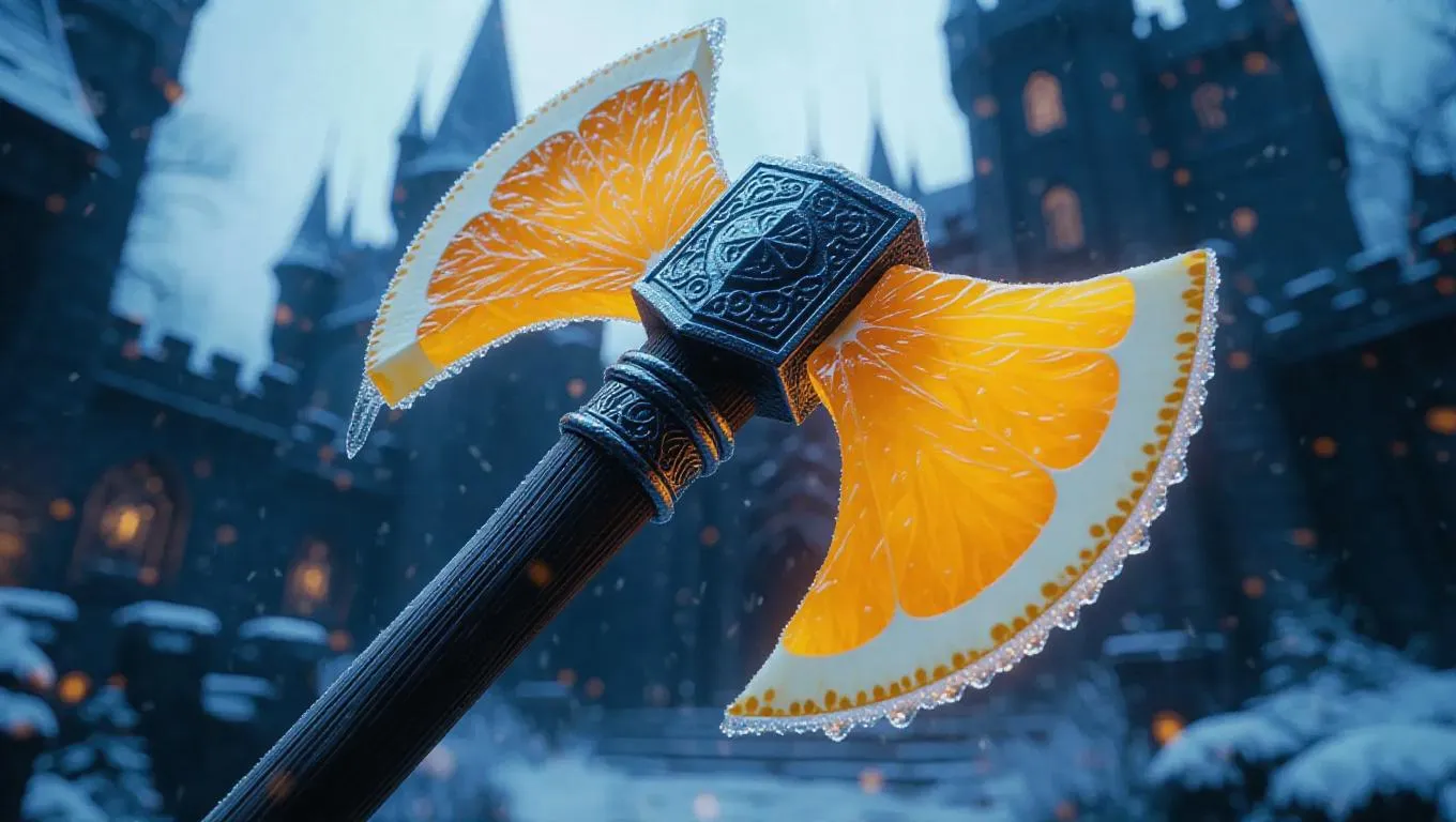 Axe crafted from frozen orange slices, shimmering with icy frost particles, glowing with a cold, ethereal light, set against a dark, enchanted castle background, capturing the essence of frosty magic.
