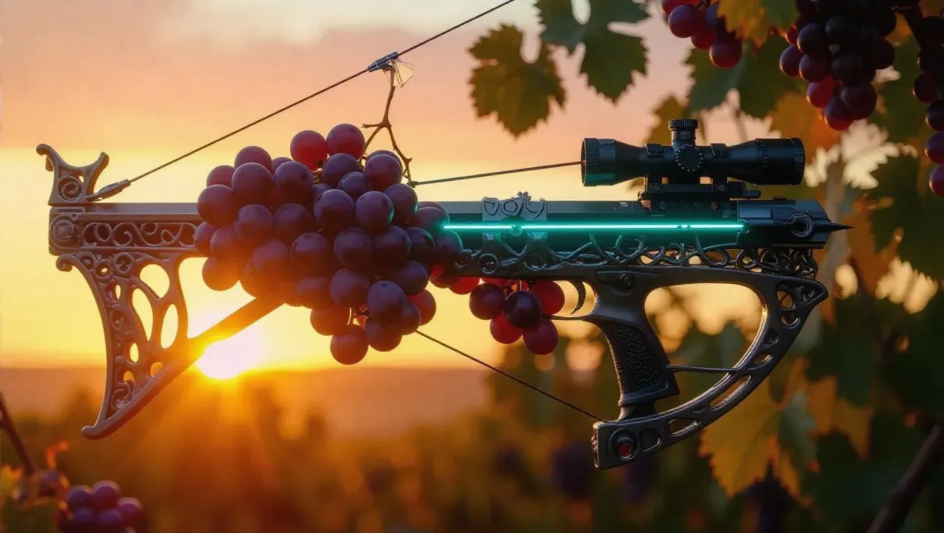 A crossbow with silver limbs and a teal glow, shooting grapes with precision, set against a sunset backdrop, creating a warm and dreamy atmosphere
