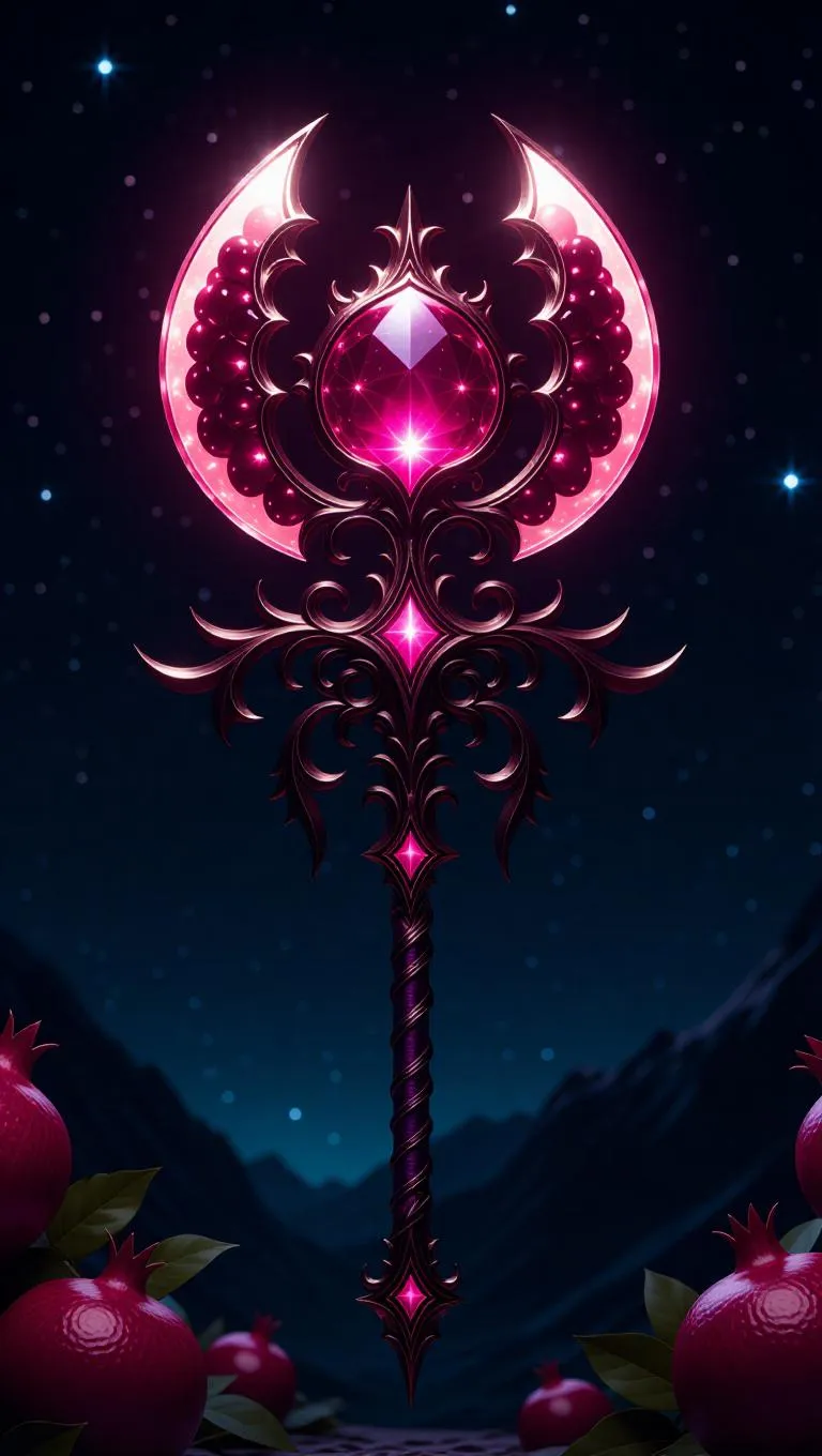 A glaive crafted from overlapping pomegranate segments, with a translucent, red core that emits a soft, celestial glow. The weapon has an intricate, ornate design, set against a starry night sky that enhances its otherworldly beauty. The scene is bathed in dim, ambient light, with stars twinkling in the background. The style is fantastical, blending realism with ethereal elements.
