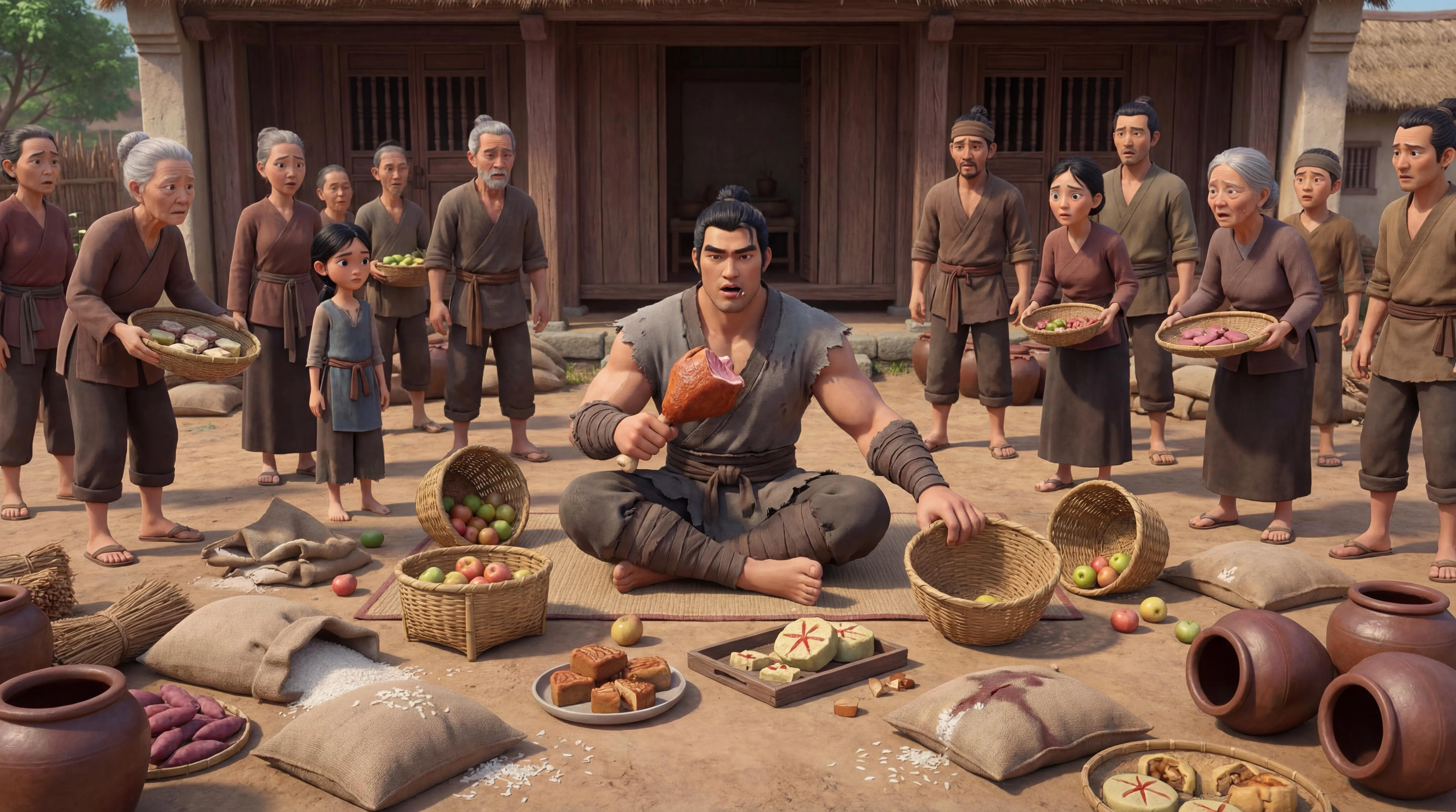 Generate an AI-powered cinematic scene: Epic 3D animation of Giong calmly demanding food amidst depleted supplies in a village courtyard. Villagers watch exhausted as earthy tones and natural light capture mythological tension. Stylized non-realistic characters, wide shot, no magic. Create this animated historical moment with Vivago.ai.