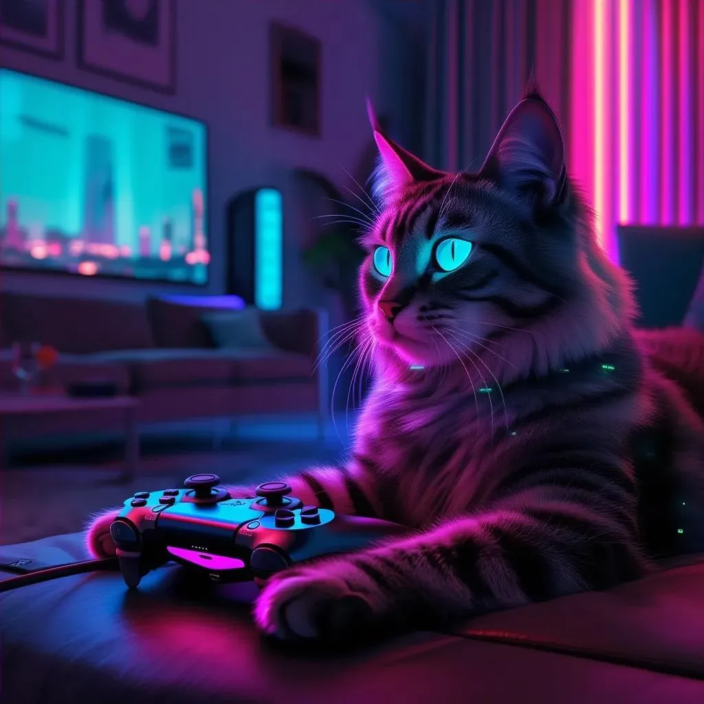 Generate a futuristic AI image of a cat playing PlayStation 5 in a neon-lit cyberpunk setting. Explore AI creativity with vivid, high-tech visuals blending virtual reality gaming, futuristic pets, and retro-futurism. Perfect for tech enthusiasts, gamers, and AI art lovers seeking imaginative, playful digital content.