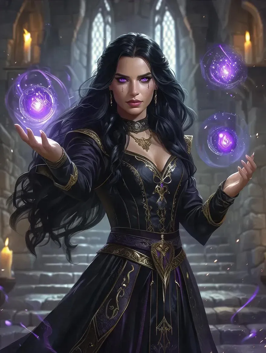 Create a photorealistic full-body portrait of Yennefer from The Witcher, showcasing her long flowing black hair, deep violet eyes, and signature black-and-gold outfit. Surrounded by mysterious dark energy, floating magical orbs, and a medieval castle backdrop with towering stone walls and flickering torchlights. AI-generated art capturing her powerful sorceress essence in a realistic style.