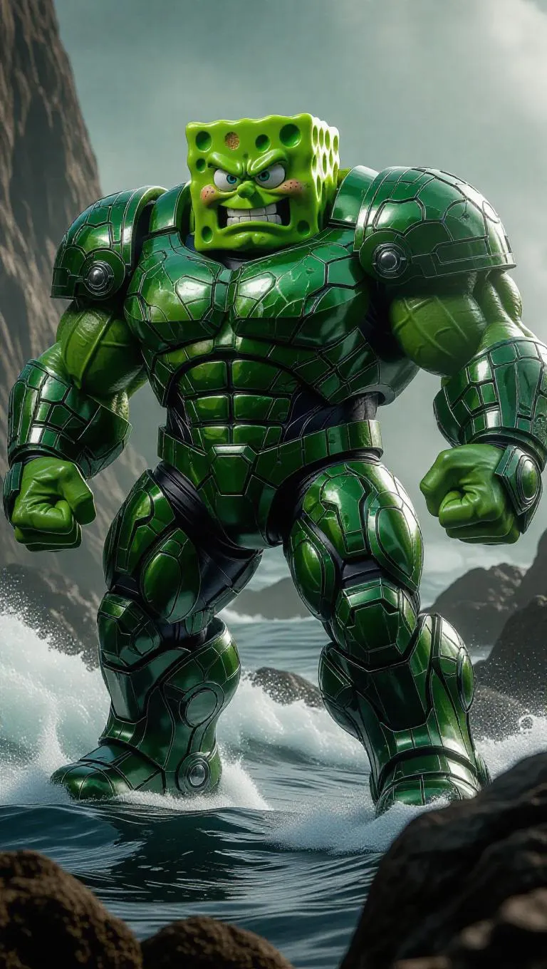 Transform SpongeBob into a Hulk-inspired AI-generated marvel with vivago.ai. Muscular green suit, metallic armor, glowing eyes, and fierce expression contrast a stormy ocean backdrop. Leverage AI image generation to create powerful character transformations, blending pop culture with dynamic environments for striking visuals. Explore AI effects for professional-grade, imaginative edits.
