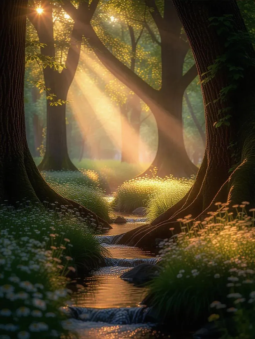 A serene forest clearing bathed in golden sunlight, towering ancient trees with gnarled roots, a crystal-clear stream meandering through the landscape, vibrant wildflowers dotting the ground, and a gentle mist rising from the earth, creating an ethereal and tranquil atmosphere.