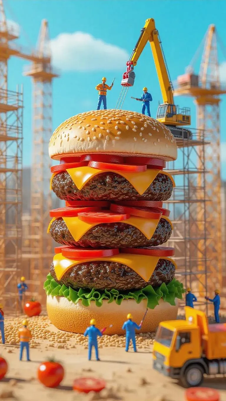 Generate a whimsical AI image of tiny construction workers building a giant burger. See miniature crews use cranes for pepperoni, jackhammers on cheese layers, and trucks hauling tomato sauce. Ideal for foodies and creatives seeking playful, imaginative visuals with professional AI tools from vivago.ai.