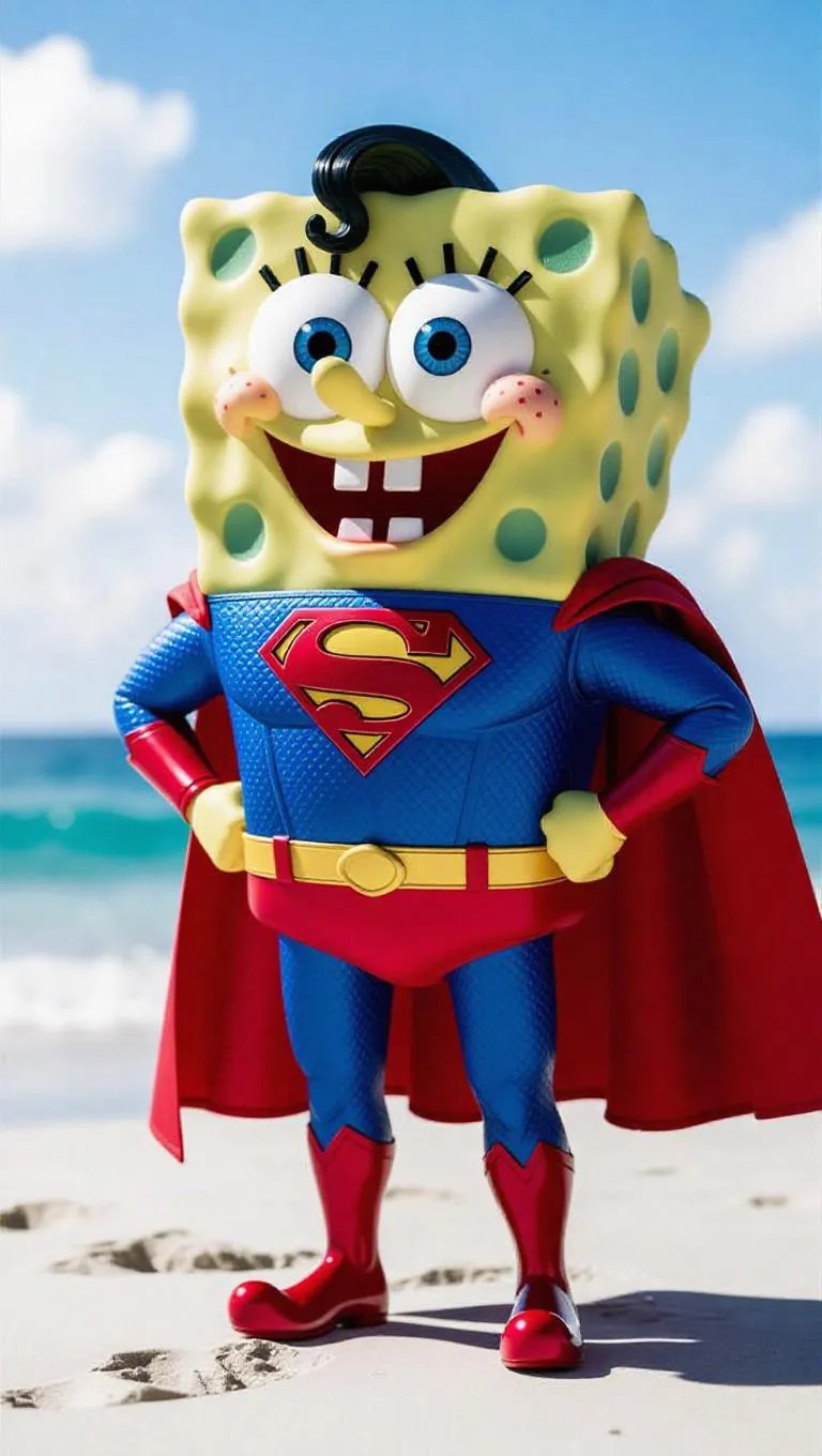 Transform SpongeBob into Superman with AI-powered creativity! Generate heroic visuals of SpongeBob in a vibrant blue-red suit, glowing 'S' emblem, and bold textures. AI art blends playful charm with superhero power—dynamic skies, ocean waves, and heroic lighting. Try VivaGo AI for stunning superhero-inspired designs, perfect for memes, fan art, or unique digital content.