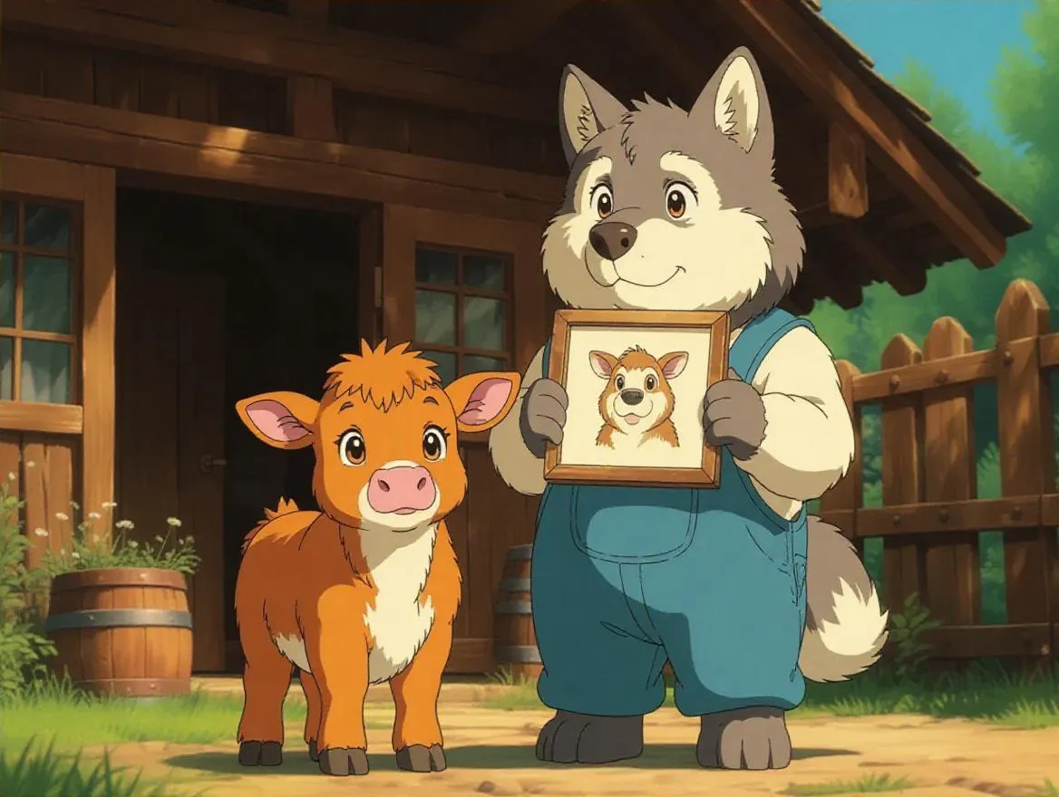 Generate enchanting Studio Ghibli-style anime art with expressive-eyed characters – a whimsical wolf in overalls and an adorable orange calf holding a cow portrait. Featuring pastel colors, rustic log cabin details, and soft lighting, this AI-crafted scene embodies cozy friendship, innocence, and Ghibli’s signature charm. Ideal for whimsical, heartwarming illustrations inspired by iconic anime aesthetics.