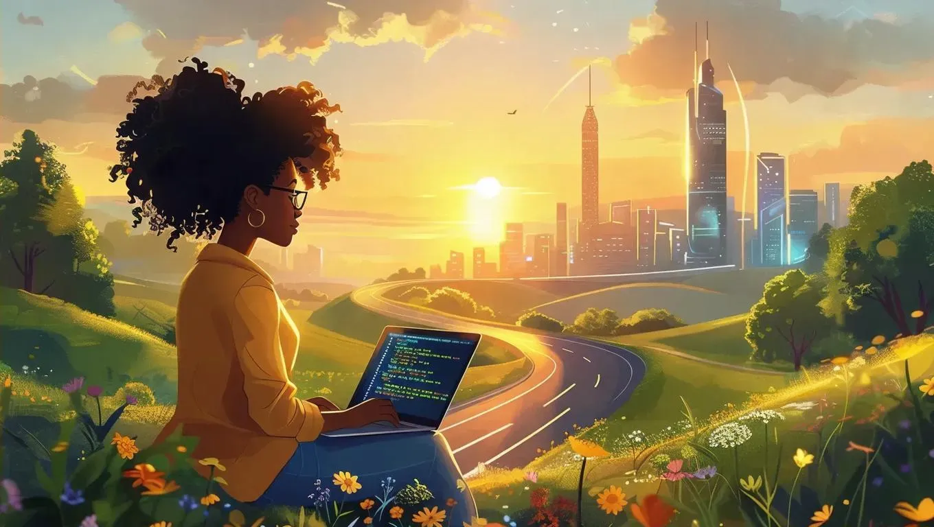 Create empowering visuals of a Black woman software developer journeying on a road with AI image generation. Transform text prompts into dynamic, professional-grade visuals celebrating diversity in tech. Perfect for storytelling, branding, or content creation—explore AI-powered tools for inclusive, high-quality imagery at VivaGo.ai.