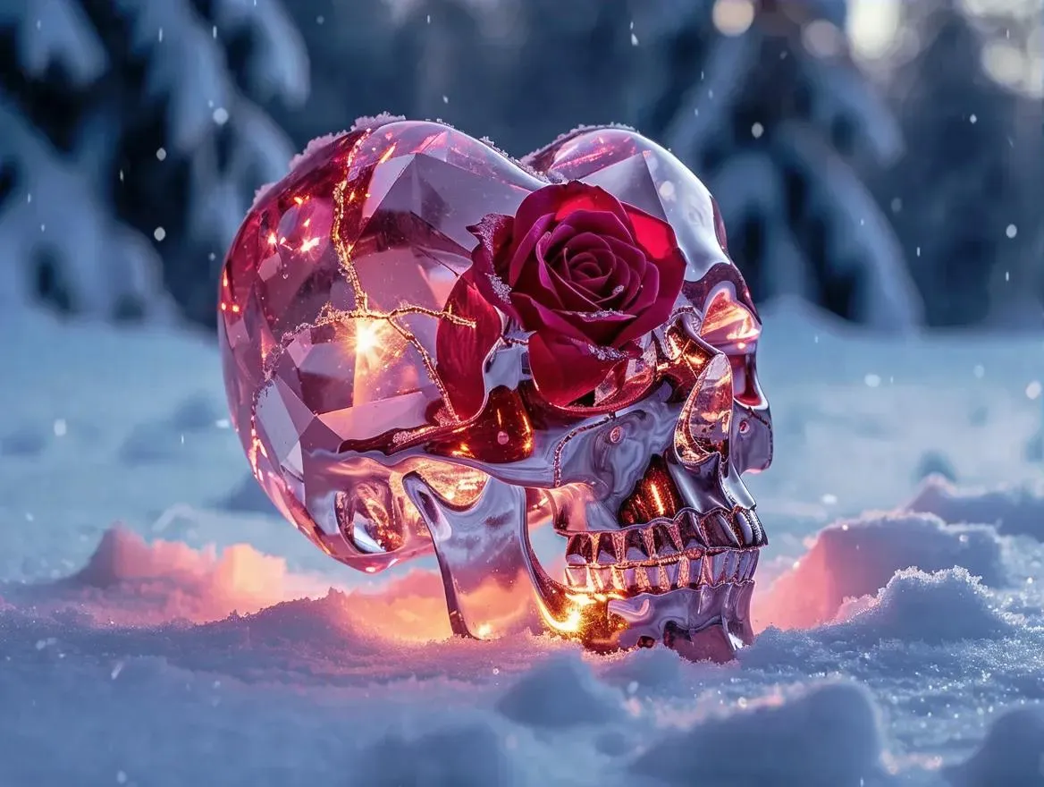 Create a cinematic rose skull heart snow design with AI-powered neon cold lighting and crystal-like textures. Transform edgy concepts into striking visuals using Vivago.ai's advanced effects for professional-grade, surreal imagery blending organic elements and icy futurism.
