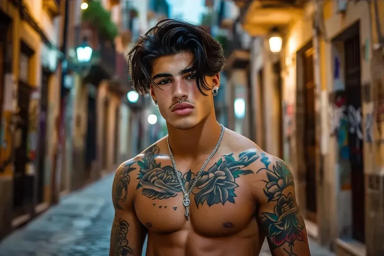 Generate AI visuals of a muscular Spanish teen with black hair, neck tattoos, dark eyes, and dimples using vivago.ai's AI image tools. Transform text prompts into striking portraits with realistic details like full lips and body art for creative projects.