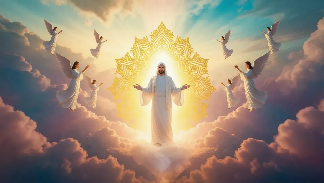 Create divine AI art visualizing Allah in a heavenly realm with celestial light, intricate golden arabesques, and angelic figures. Experience serene, omniscient divinity amid shimmering clouds and vibrant hues. Generate reverent, awe-inspiring imagery blending spirituality and AI creativity. Perfect for sacred art, cultural projects, or tranquil visual storytelling.