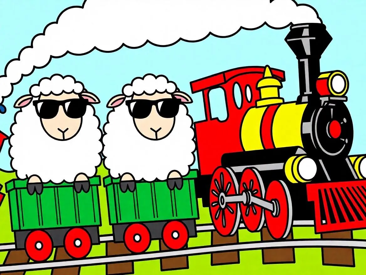 Generate a quirky AI drawing of cool sheep sporting trendy sunglasses and riding a train. Create this stylish cartoon illustration with vivago.ai's powerful image generation tools. Perfect for unique animal art or whimsical transportation graphic concepts. AI-powered image generator for creative prompts.