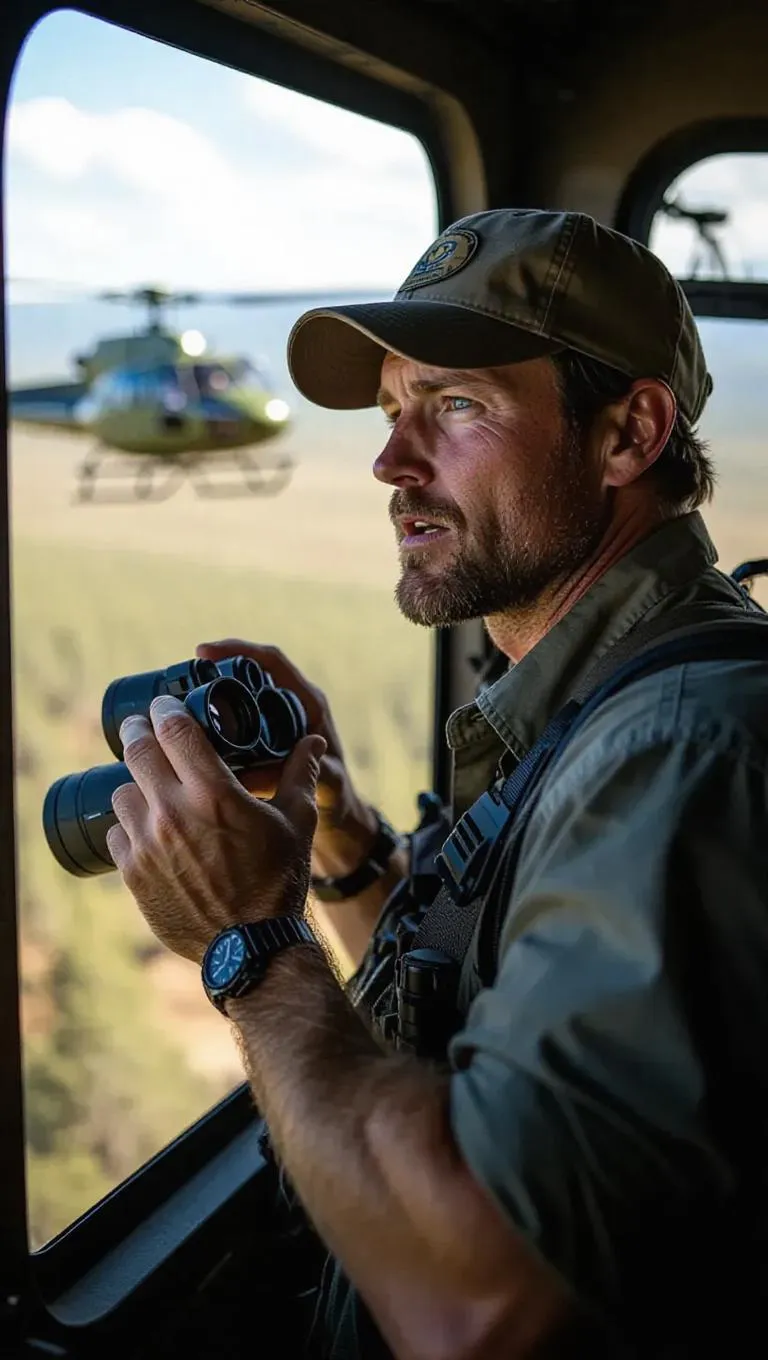 AI-generated image of a wildlife ranger spotting an injured eagle through binoculars from a remote lookout tower. Dramatic cliffs, vast wilderness, and a rescue helicopter evoke urgency in this action-packed scene. Perfect AI art for nature conservation themes, wildlife rescue storytelling, or adventure-inspired visual projects. Create dynamic visuals with precision using Vivago.ai's photo-realistic generation tools.