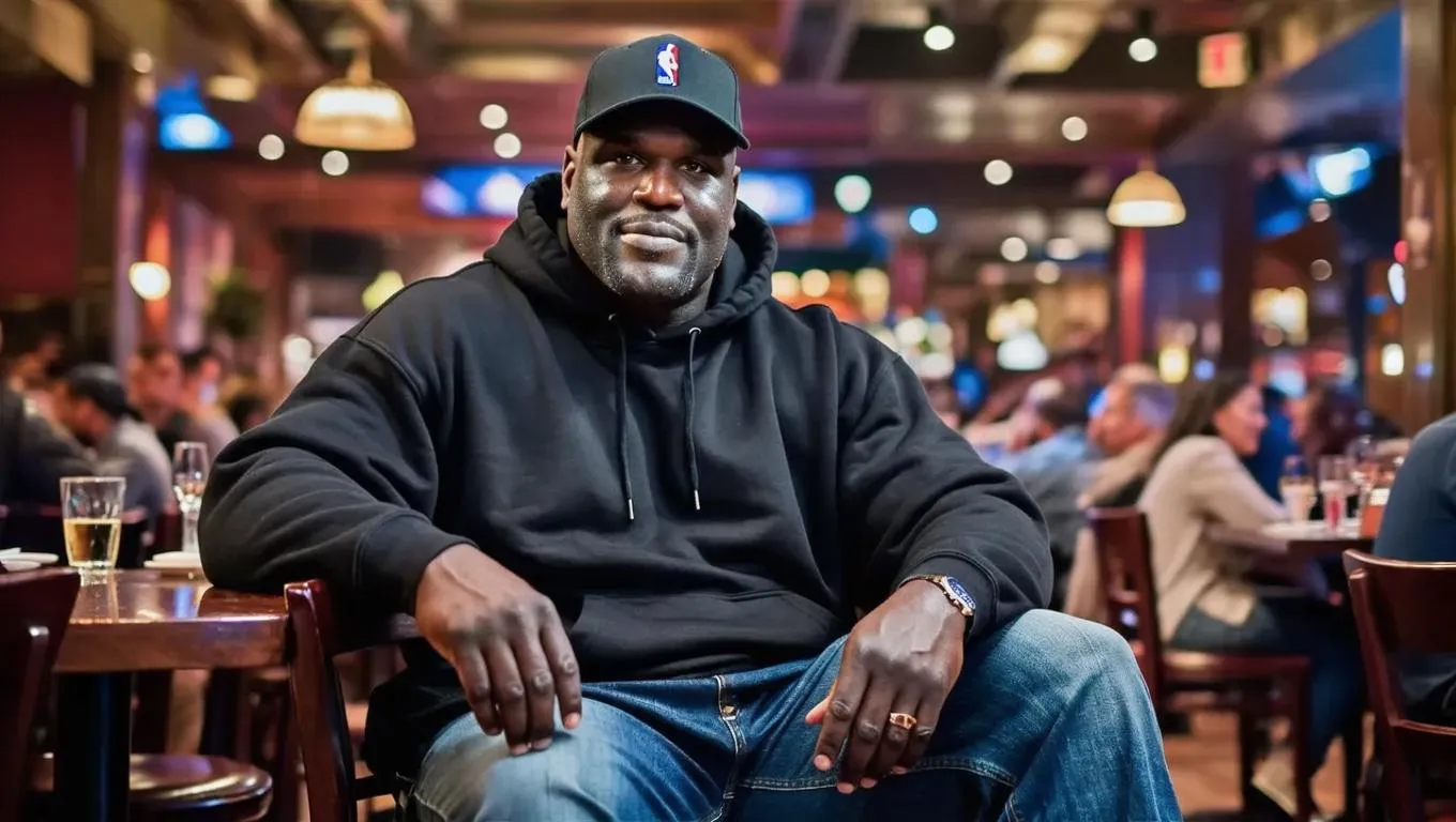 Generate a realistic AI image of Shaquille O'Neal in casual attire - black hoodie, jeans, and a low baseball cap - at a restaurant. Ideal for celebrity AI art, streetwear inspiration, and photorealistic scene generation using VivaGo.ai's advanced image creation tools.