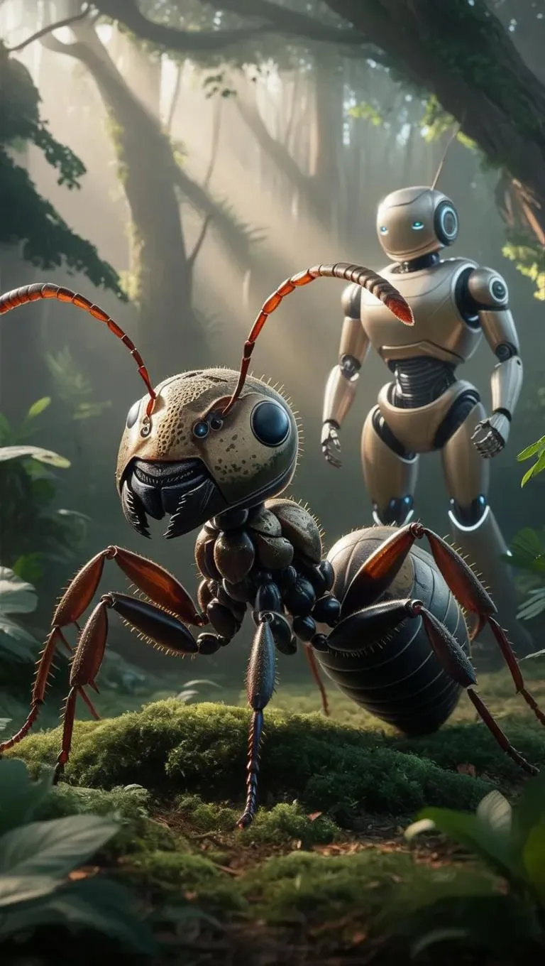 Transform text into stunning AI visuals with this serene nature-tech blend. Generate a detailed ant and futuristic robot harmonizing in a misty forest. Soft natural light, metallic textures, and organic elements create peaceful AI-generated imagery. Perfect for exploring human-AI coexistence through vivid, professional-grade art.