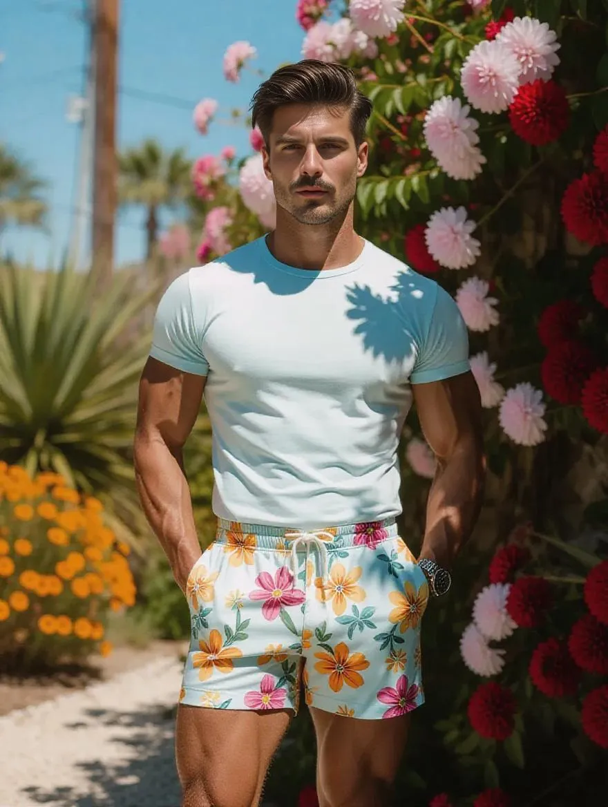 Generate a 1960s-inspired hunky male model with retro mustache and pompadour hairstyle, dressed in floral short shorts and vintage tee. Capture sensual outdoor summer vibes using AI image generation for retro-themed photoshoots, fashion content, or vintage advertising visuals. Professional 60s aesthetic enhancement powered by vivago.ai's creative AI tools.