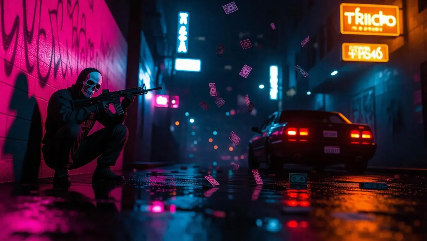 Craft a gritty GTA-inspired urban battle scene with vivago.ai. AI-generated ultra-detailed Los Santos streets at night: neon-lit wet asphalt, graffiti walls, bullet holes, burning cars, and masked gang members. Capture cinematic tension with flying cash bundles, smoky haze, and dramatic lighting for professional-grade visuals. Perfect for gaming aesthetics or action-packed AI art projects.