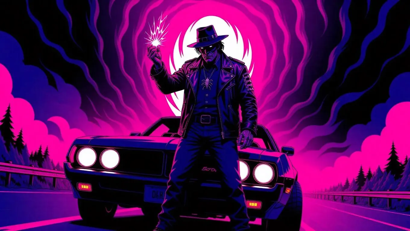 AI-generated image of a grizzled drifter gripping a glowing time shard atop a Firebird, blending Mike Mignola's bold inks with 'Scorn' biomechanics. Dramatic neon-lit scene features a cosmic fungal highway, Pennywise's silhouette, and intense close-up perspective. Explore AI art tools for surreal horror visuals, dynamic shadows, and hybrid styles on VivaGo.ai.