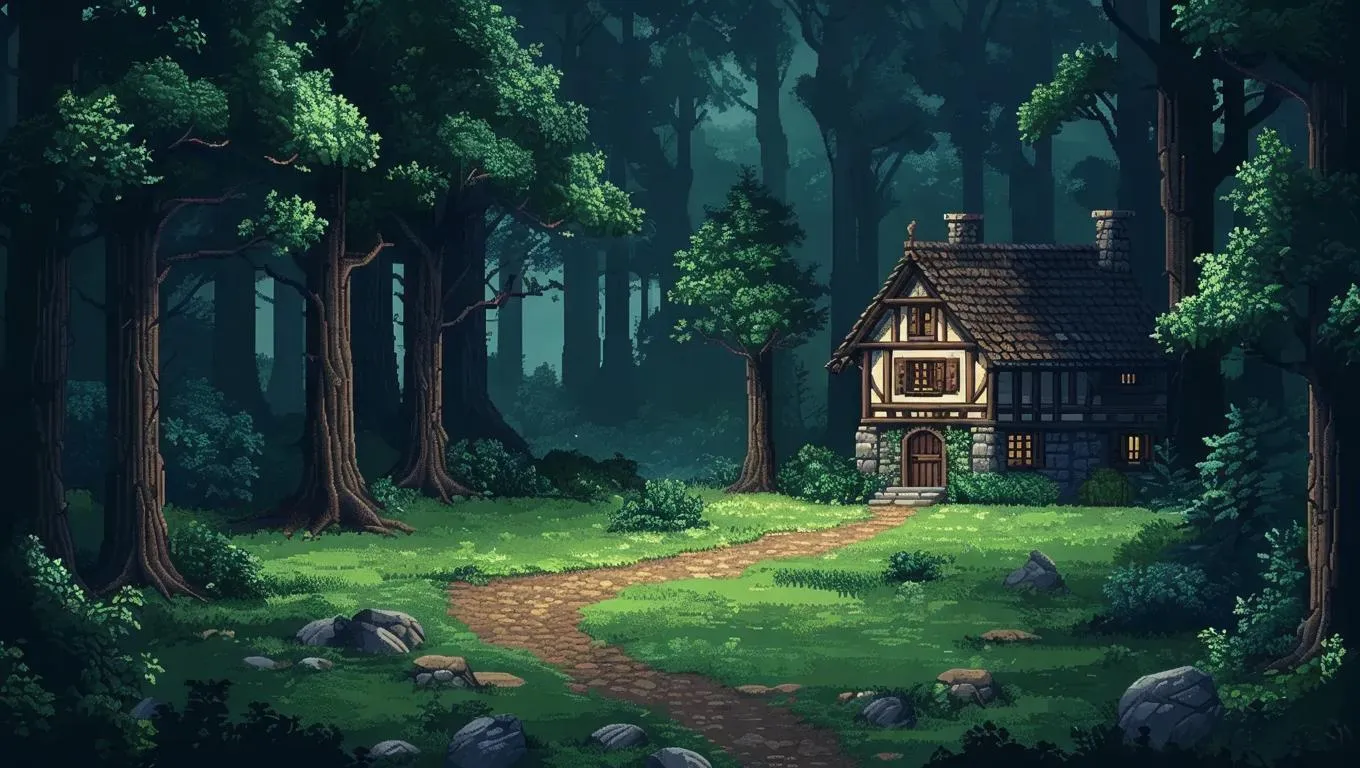 Craft an eerie dark fantasy pixel art background with a sprawling Dark Forest and a subtle, distant inn on the right. This AI-generated artwork emphasizes atmospheric depth, mystical ambiance, and intricate details, ideal for immersive game environments while keeping the inn minimal to highlight the haunting woodland theme.