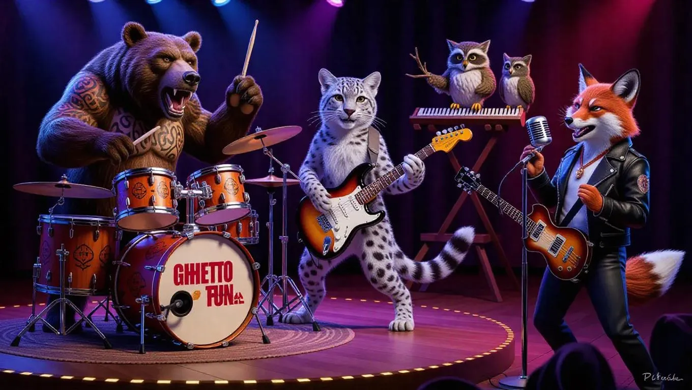 Vibrant AI-generated artwork of an anthropomorphic animal band performing with dynamic musical synergy. Features a tattooed grizzly drummer, snow leopard guitarist, charismatic fox vocalist, and quirky forest-inspired instruments. Rich details in fur textures, glowing stage lighting, and expressive personalities blend ghetto-punk energy with fantastical woodland or jazz club aesthetics. Perfect for music-themed digital art enthusiasts seeking wild, imaginative concert visuals.