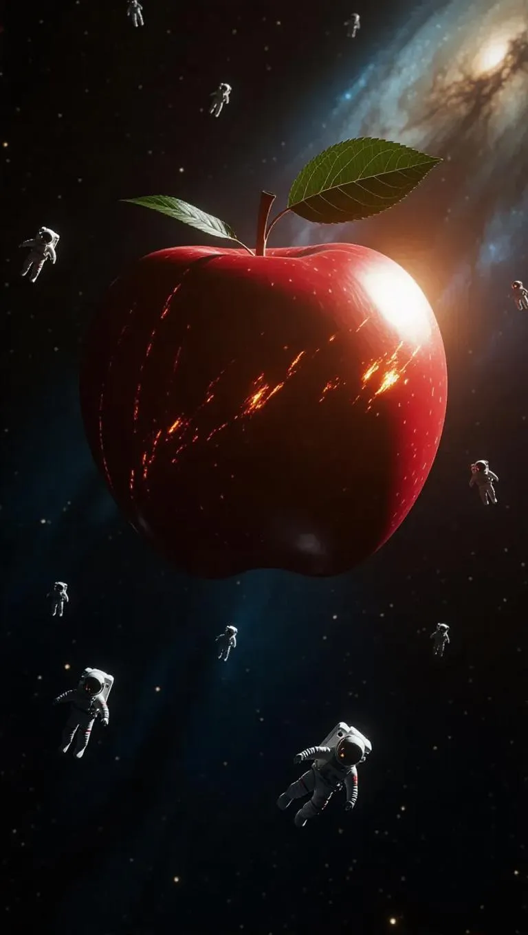 Generate a surreal cinematic scene of an apple-shaped planet with orbiting satellites and astronauts using AI-powered tools. Transform text prompts into vivid, professional visuals with VivaGo.ai's advanced effects for space exploration and creative sci-fi artistry.