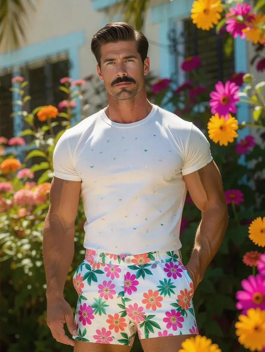 Generate a 1960s-inspired hunky male model with retro mustache and pompadour hairstyle, dressed in floral short shorts and vintage tee. Capture sensual outdoor summer vibes using AI image generation for retro-themed photoshoots, fashion content, or vintage advertising visuals. Professional 60s aesthetic enhancement powered by vivago.ai's creative AI tools.