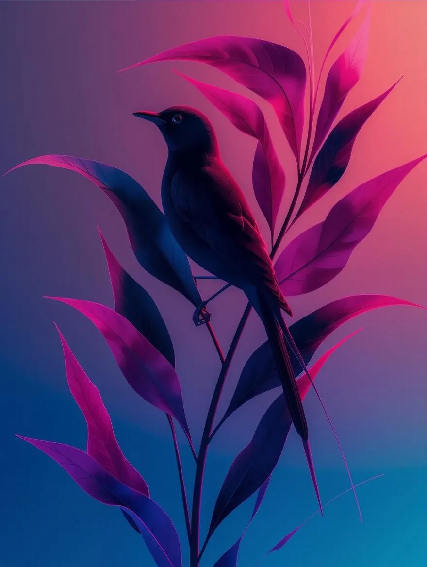 A sleek, minimalist bird in deep navy and charcoal perches elegantly on a tall, sinuous plant with vivid pink-red stems that arc like calligraphic strokes. The bird’s streamlined form, with a short beak and long flowing tail, balances delicately, its sharp silhouette set against a surreal gradient backdrop of violet, plum, and twilight indigo. Soft glows edge the plant and bird, hinting at ambient fantasy light. The clean, expressive composition evokes a dreamlike stillness, fusing contemporary nature minimalism with a surreal atmosphere.