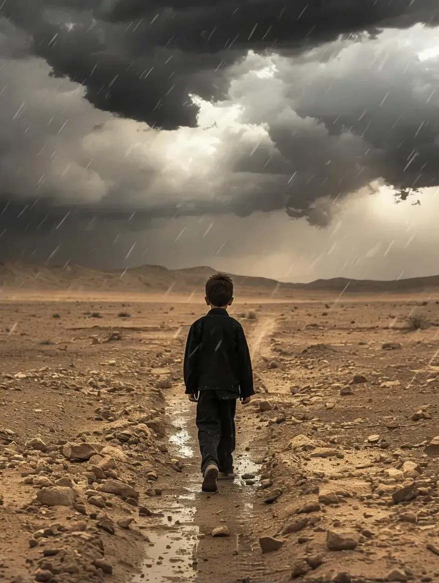 Create a striking AI-generated image of a boy in black clothes walking through a desert under cloudy skies, face obscured for mystery. Use vivago.ai's text-to-image tools to craft atmospheric visuals with dramatic contrasts and AI effects. Perfect for moody, enigmatic storytelling in creative projects.