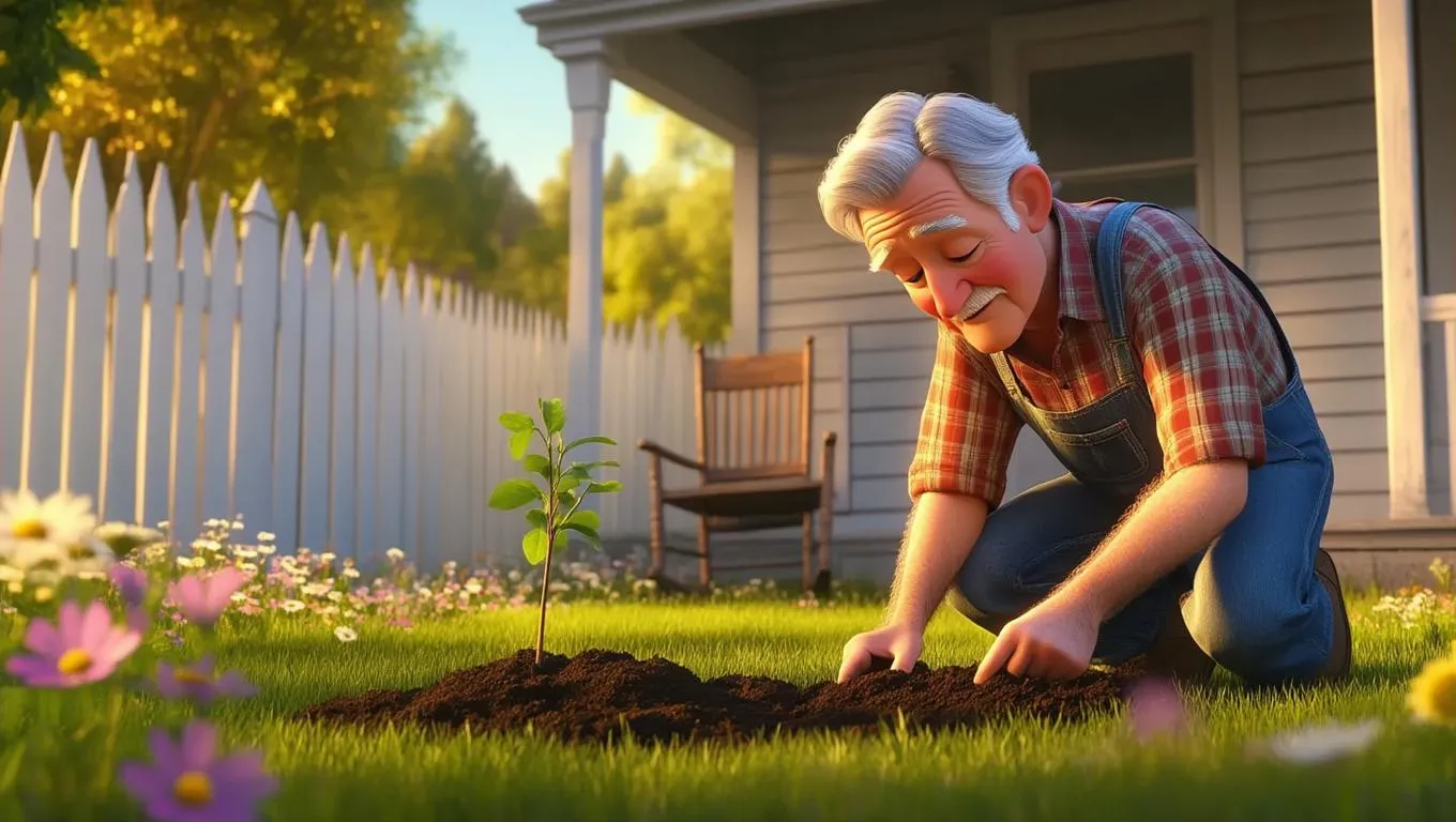 Create Disney Pixar-style AI-generated artwork of an elderly man planting a sapling in a nostalgic backyard. Features warm golden lighting, wildflowers, a wooden house, and a weathered rocking chair. Ideal for AI image generation tools, blending peaceful moods, detailed textures, and cozy storytelling visuals.