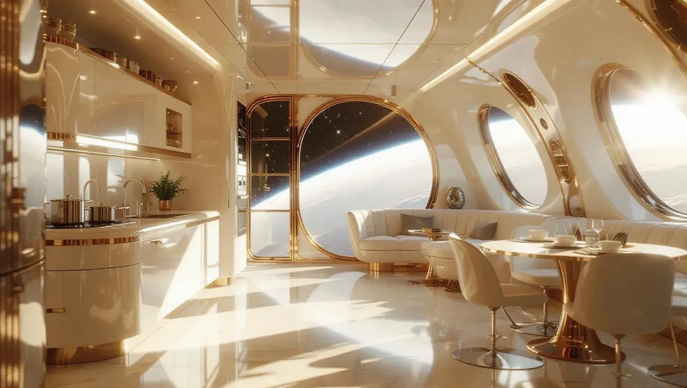 Generate ultra-realistic 8K AI images of a luxury art nouveau spacecraft kitchen with panoramic space views. Vivago.ai crafts photorealistic sci-fi interiors blending retro-futuristic furnishings, beige porcelain finishes, and cinematic daylight effects for high-contrast, ultra-detailed solarium designs. Transform prompts into HD masterpieces with advanced AI image generation tools for architectural splendor.