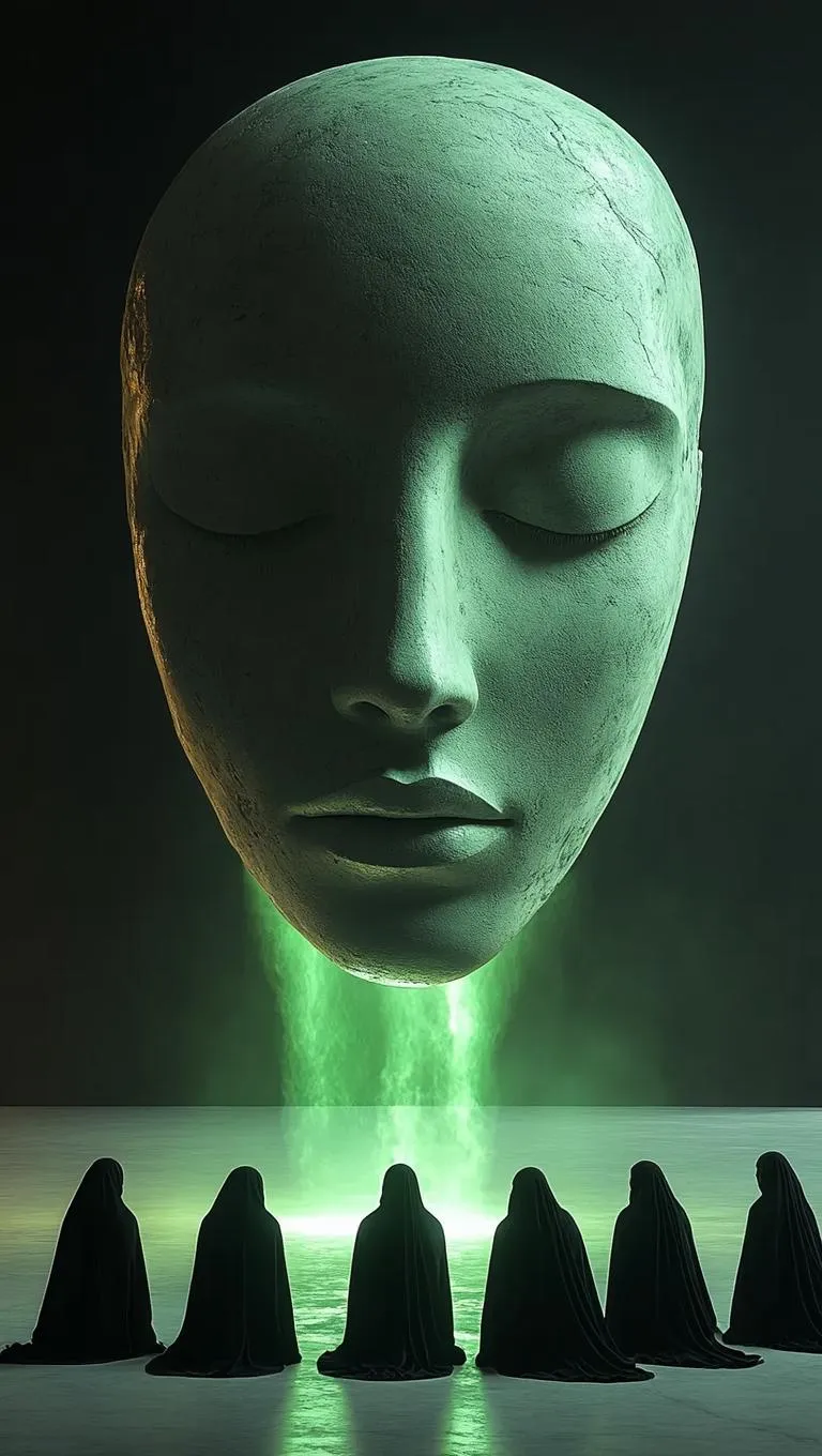 Surreal AI-generated imagery of a floating giant head sculpture, cloaked figures kneel as green soul light ascends. Minimalist black and green palette merges mystical worship with abstract art. Explore AI-powered surrealism, ethereal visuals, and symbolic storytelling through cutting-edge image generation.