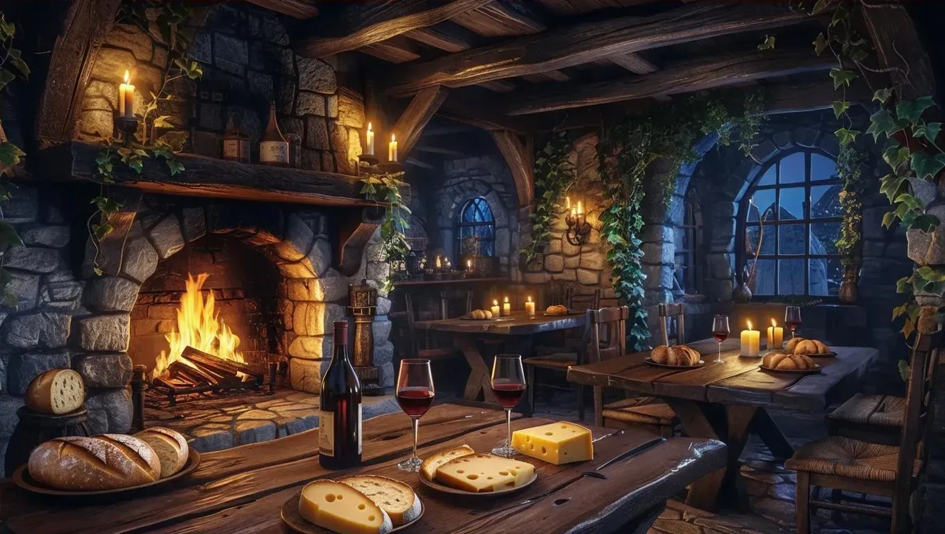 Step into a haunted medieval tavern with Vivago.ai's AI-generated imagery. Stone fireplace, wooden tables laden with bread, cheese, and wine under eerie candlelight. Nighttime ambiance with ivy-covered walls for a spooky, historical vibe. Create captivating ghostly visuals with AI-powered effects and precision editing tools.