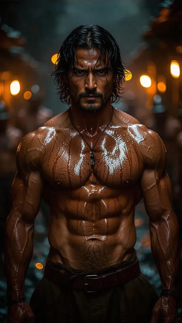 Generate cinematic AI visuals of a KGF-inspired hero: bare-chested protagonist on a rocky perch, sweat-glazed skin, windswept hair. Dark backdrop features laborers under harsh lights, symbolizing rebellion. Craft dramatic, coal-dusted scenes effortlessly with Vivago.ai's AI image generator and professional editing tools.