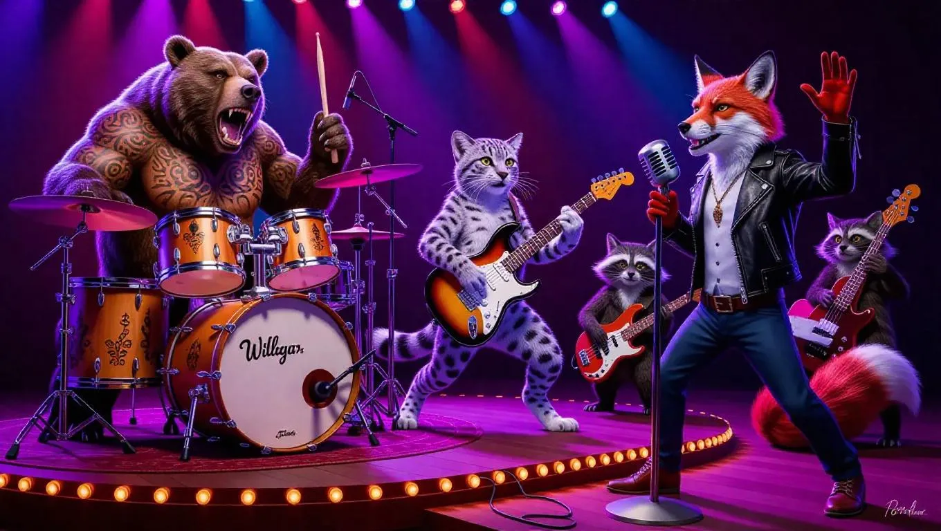 Vibrant AI-generated artwork of an anthropomorphic animal band performing with dynamic musical synergy. Features a tattooed grizzly drummer, snow leopard guitarist, charismatic fox vocalist, and quirky forest-inspired instruments. Rich details in fur textures, glowing stage lighting, and expressive personalities blend ghetto-punk energy with fantastical woodland or jazz club aesthetics. Perfect for music-themed digital art enthusiasts seeking wild, imaginative concert visuals.