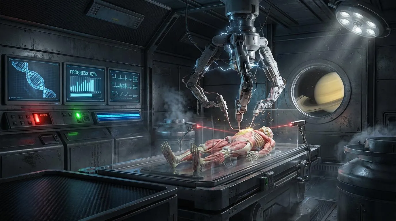 Photorealistic hyper-detailed interior of a dimly lit bioprinting lab aboard a massive orbital space station orbiting Saturn, narrow viewport revealing faint golden planetary haze and shadowy rings against the endless black void. Central element: towering industrial 3D bioprinter with precise robotic arms depositing viscous bio-ink in meticulous layers – human skeleton forming with porous bone structure, muscle fibers layering in muted red tones, vascular network filling with dark fluid via thin conduits, dermal layers emerging semi-transparent then gaining pale pigmentation, facial features developing with closed eyes; laser scanners emitting focused red beams verifying layers amid minimal sparks. Sparse tech elements: three large wall-mounted monitors displaying essential data – single rotating DNA model, progress gauge at 67%, vital signs readout; select console panels with targeted LEDs only – isolated red error light flashing slowly, single green status indicator, faint blue data stream along one edge; cryogenic vapor venting softly, subtle electrical hum. Stark chiaroscuro lighting: cold Saturn light barely filtering through, harsh surgical spotlights creating deep black shadows on matte gray titanium surfaces and scuffed carbon fiber, dust motes visible in thin light beams. Cinematic wide-angle shot with deep depth of field, ultra-photorealistic, 8K HDR, 16:9 aspect ratio.