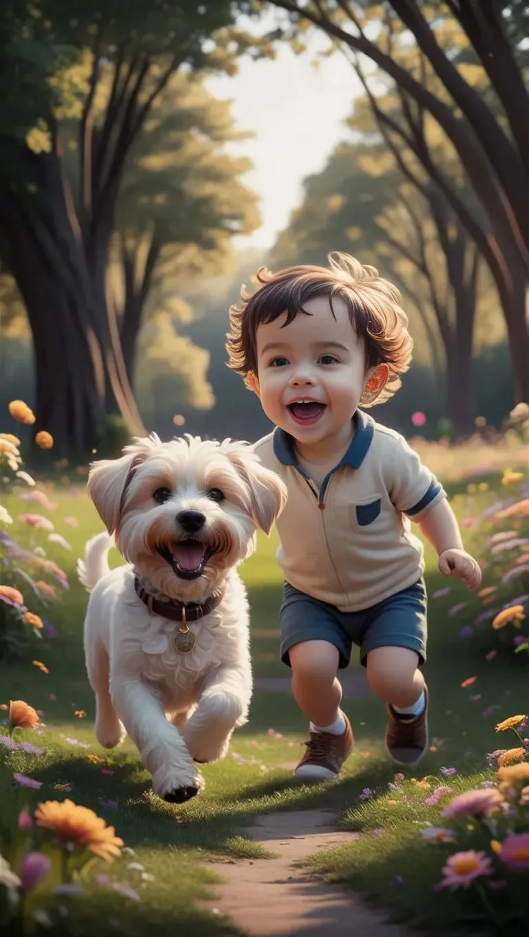 Create captivating 3D animations with AI! Generate hyperrealistic scenes of a playful toddler and energetic white dog in a sunlit park. Vivago.ai offers advanced AI effects tools for vibrant, lifelike visuals. Perfect for professional-grade 3D animation and creative storytelling.