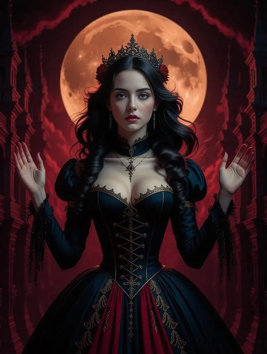 "Vivago.ai crafts photorealistic AI-generated art: ultra-wide gothic castle backdrop with Lady Death in Victorian red/gold dress, flowing hair, blood moon night scene. 8k resolution masterpiece by Martin Bobzert combines intricate details, cinematic lighting, and psychedelic fantasy realism. Professional AI tools for maximalist concept art with elegant reflections and expansive empire estate atmosphere."