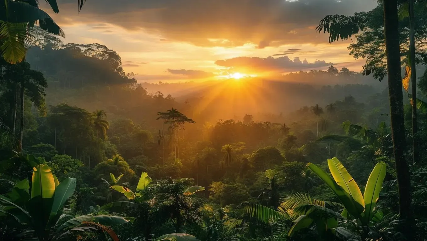 Generate vibrant AI visuals of a jungle sunrise with misty atmospheres, golden sunlight piercing dense foliage, and tropical wildlife. Vivago.ai transforms text prompts into vivid, realistic dawn scenes using advanced AI effects. Perfect for creating immersive jungle landscapes, dynamic lighting, and nature-inspired digital art in seconds.