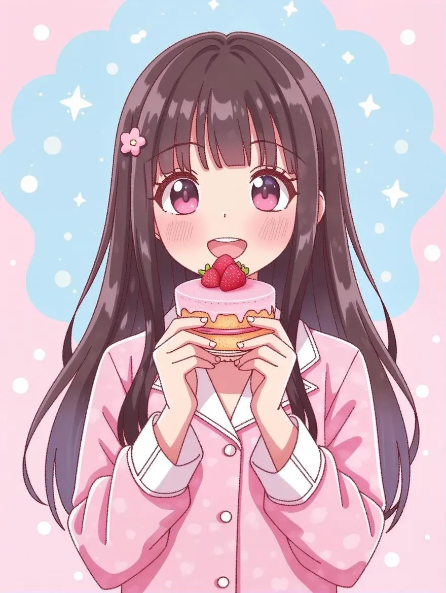 A cute girl with long hair and bangs, holding a cake in her hand, wearing pink pajamas, set against a dreamy background with light blue tones and simple lines, in the style of Japanese manga. The pink atmosphere and the pink cake create a happy, whimsical scene. The expression on her face is one of joy as she eats the strawberry-filled cake, her eyes sparkling with delight.