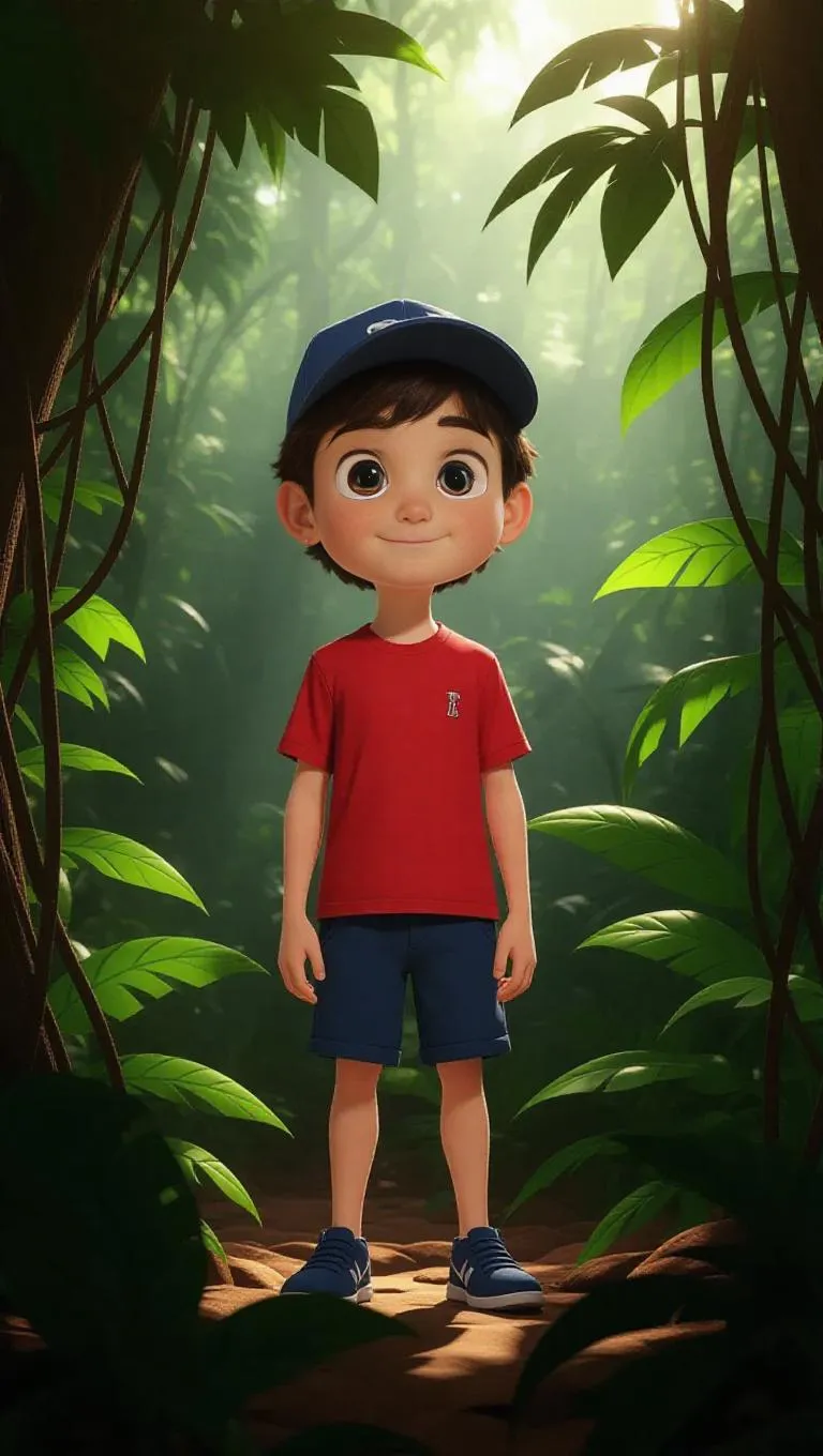 Create vibrant AI cartoon jungle art with vivago.ai. Transform text into a lush, green rainforest scene featuring a cheerful 8-year-old boy in red shirt and blue cap. Perfect for playful adventure themes, our AI generates vivid lighting, detailed vines, and lively character designs for professional-grade visual storytelling.