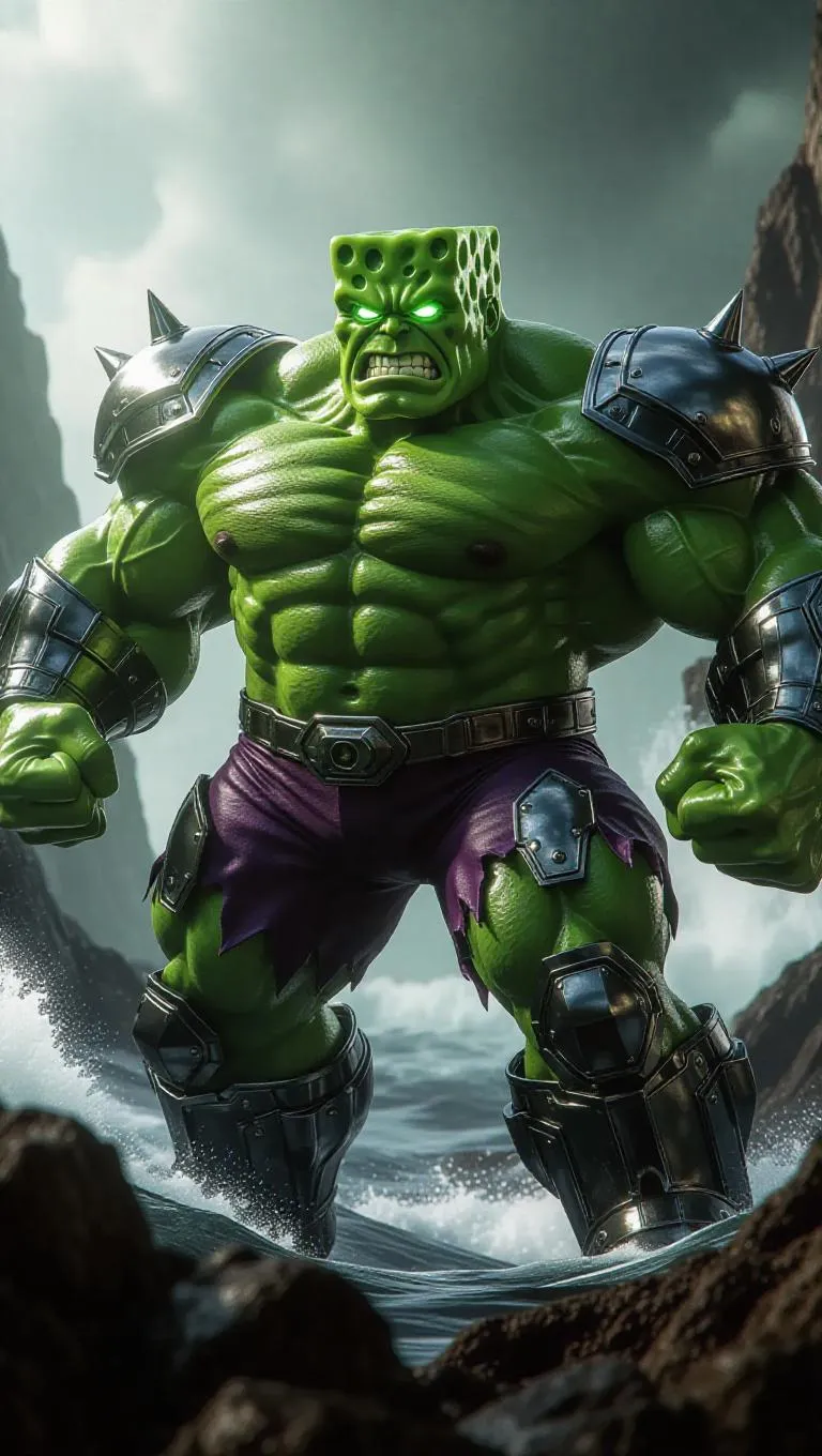 Transform SpongeBob into a Hulk-inspired AI-generated marvel with vivago.ai. Muscular green suit, metallic armor, glowing eyes, and fierce expression contrast a stormy ocean backdrop. Leverage AI image generation to create powerful character transformations, blending pop culture with dynamic environments for striking visuals. Explore AI effects for professional-grade, imaginative edits.