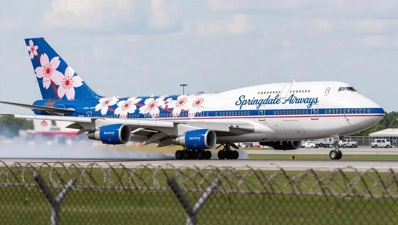 Experience the retro charm of Springdale Airways' 747-200 with a vintage livery: white fuselage, cursive logo, blue tail adorned with pink cherry blossoms, and a sleek cheatline. Captured in a wide-angle side view during landing.