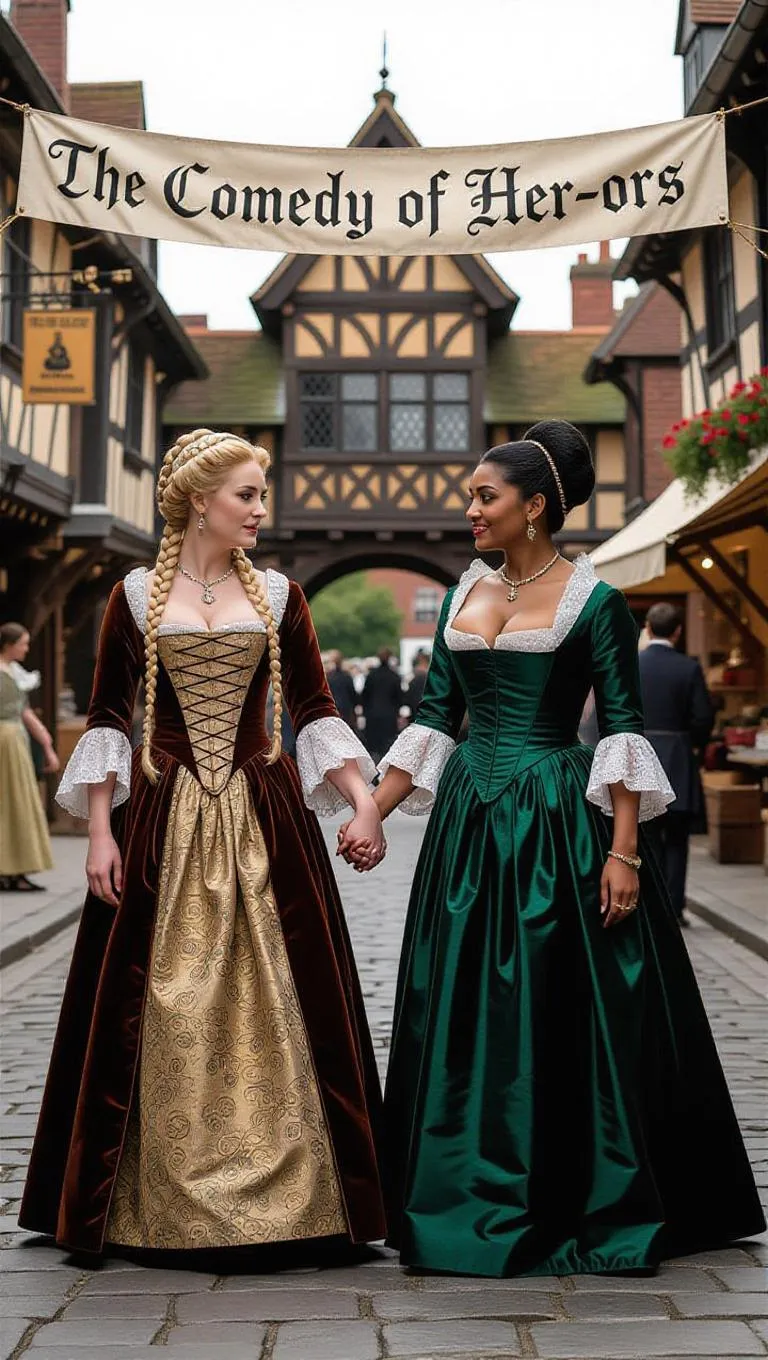 Generate hyper-realistic Shakespearean scenes with AI. Depict Adriana and The Courtesan in elaborate Elizabethan gowns, holding hands at a medieval street market on stage. Features a banner reading "The Comedy of Her-ors" at The Globe Theatre. Create stunning visuals of Elizabethan nobles, intricate silk attire, and detailed period settings effortlessly. Professional AI image generation for vivid historical scenes.