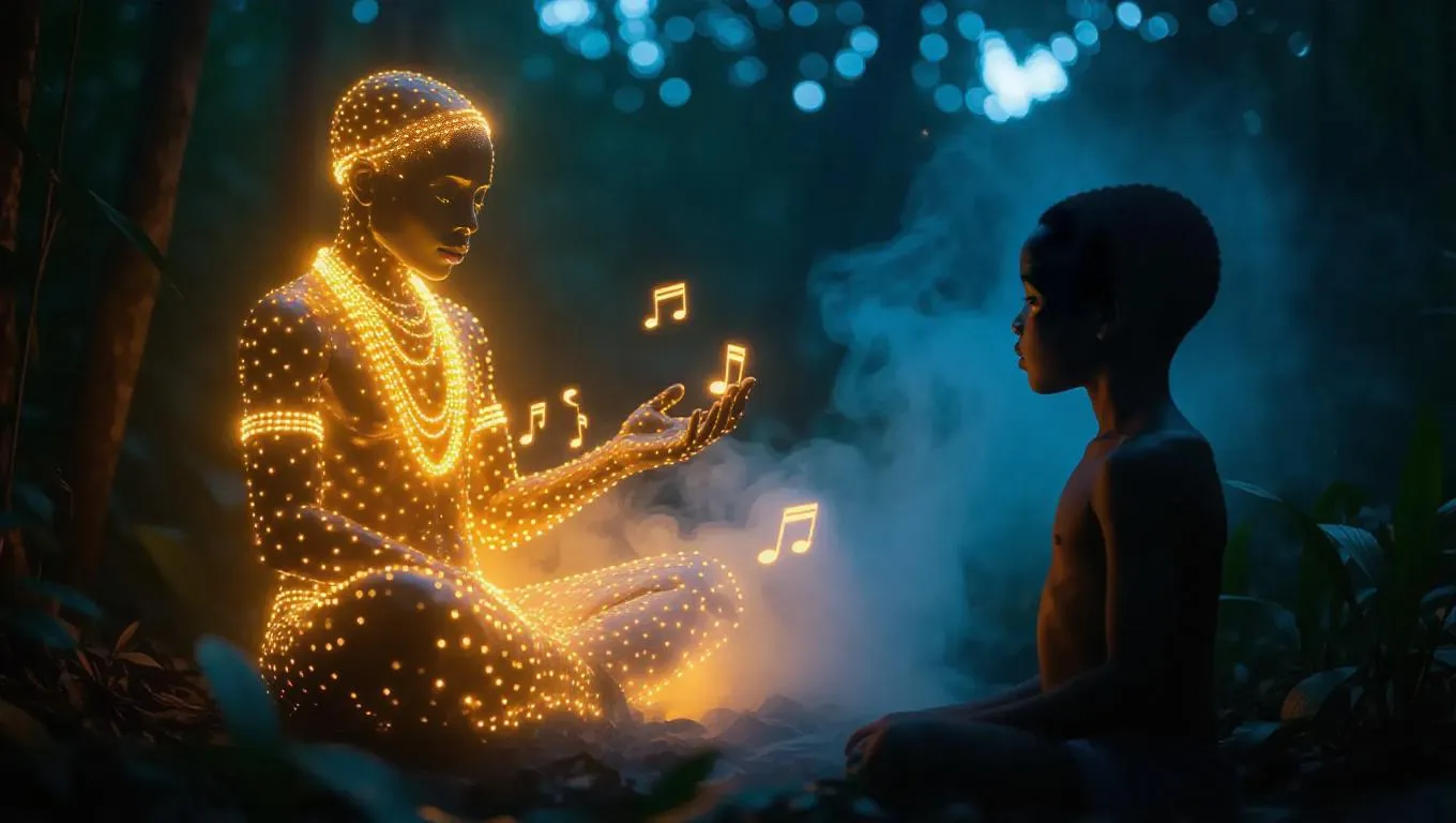 Santa and Snow White stand at the center of a group photo, flanked by seven heavy metal reindeer dressed in leather and spikes. Santa wears his traditional red suit, a mischievous grin on his face, while Snow White dons a festive, glittering dress. The reindeer, with fierce expressions and elaborate stage makeup, hold various instruments. The scene is set in a snow-covered forest, with twinkling lights and a full moon casting a warm, golden glow. Soft, diffused front light enhances the festive atmosphere, creating a realistic and vibrant image.