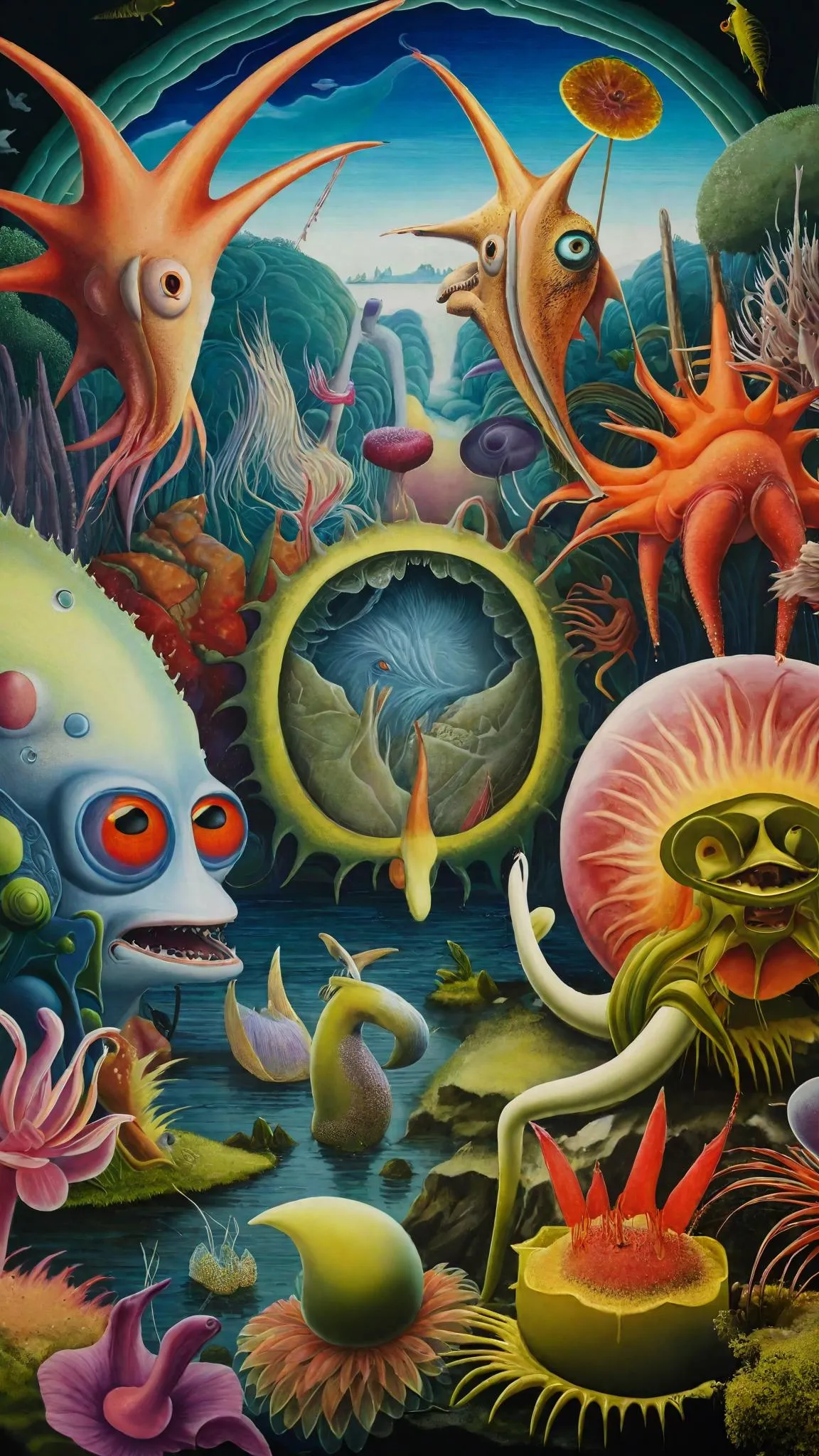 Pablo amaringo, Diego rivera, style - garden of earthly delights. Creatures (sea creatures) Hyper realistic triple pane picture. Carboniferous geological time frame