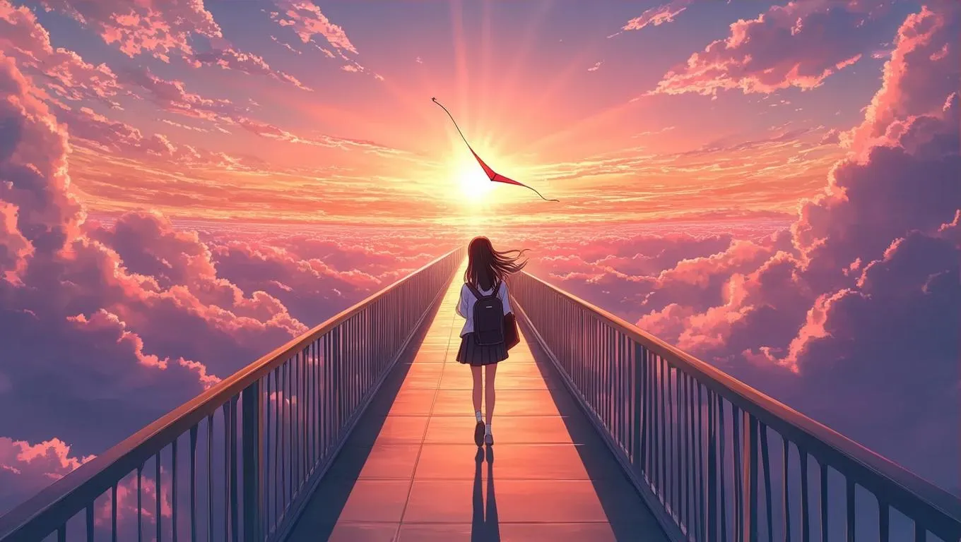 Transform text into stunning AI-generated anime scenes with Vivago.ai. Create serene, cinematic visuals of a floating bridge over pink-orange sunrise clouds, students walking, and a lone kite. Wide-angle watercolor effects amplify the hopeful, dreamy atmosphere. Perfect AI art for ethereal, cinematic storytelling.