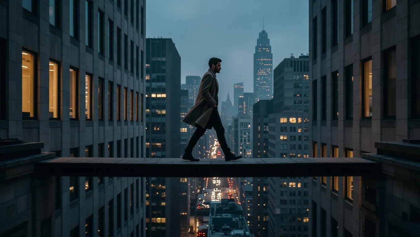 Capture hyperrealistic AI-generated visuals of a man balancing on a narrow rooftop walkway between symmetrical towers. Experience Hollywood-style cinematic tension with blurred city lights, dynamic wind effects, and precise geometric framing. Inspired by social realism and performance photography, this prompt merges breath-taking suspense with hyper-detailed realism for professional-grade AI video or image generation.