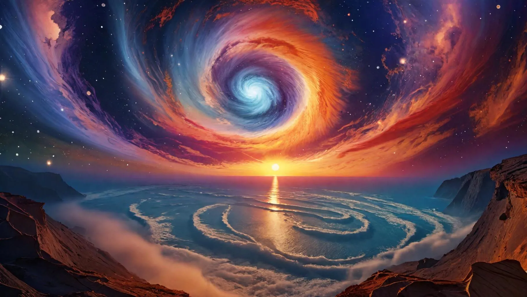 Create mesmerizing AI-generated cosmic sunsets with vibrant galaxies swirling over tranquil oceans. Vivid orange, red, and blue hues blend celestial beauty with serene waters. Craft stunning space art and professional-grade AI visuals. Transform text prompts into breathtaking cosmic landscapes using Vivago.ai's advanced AI effects.